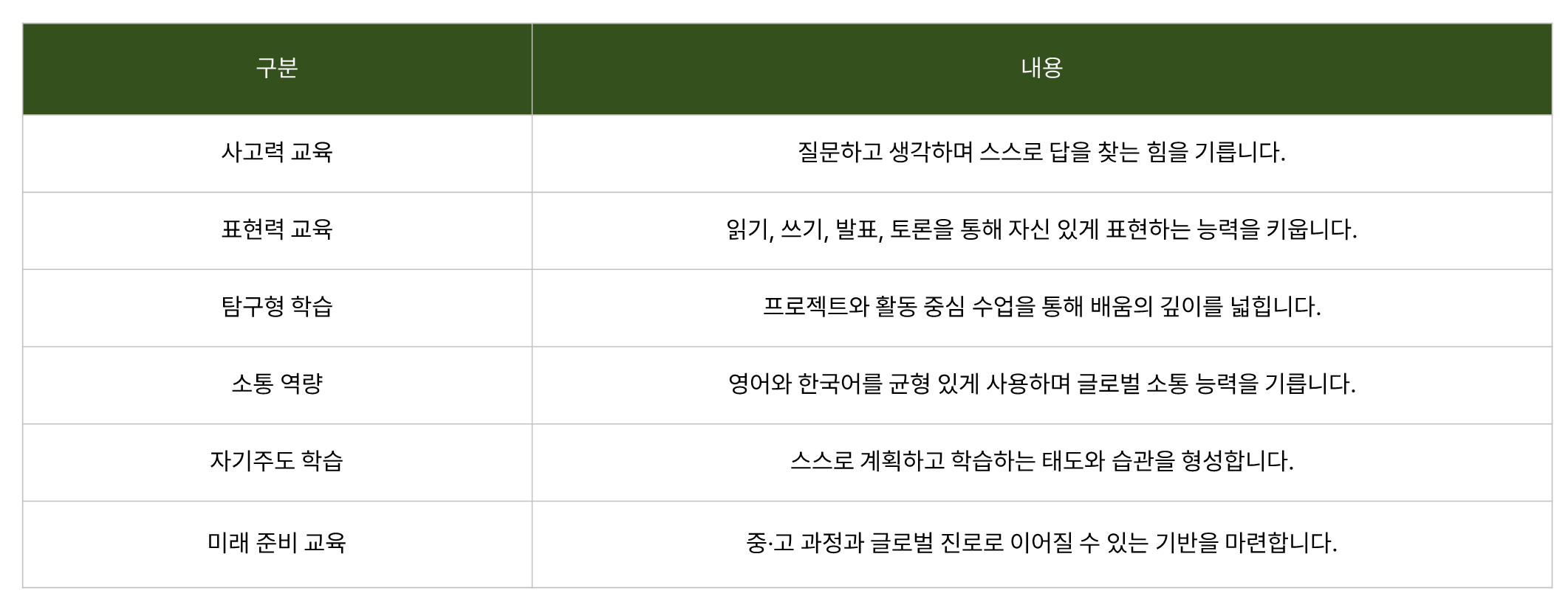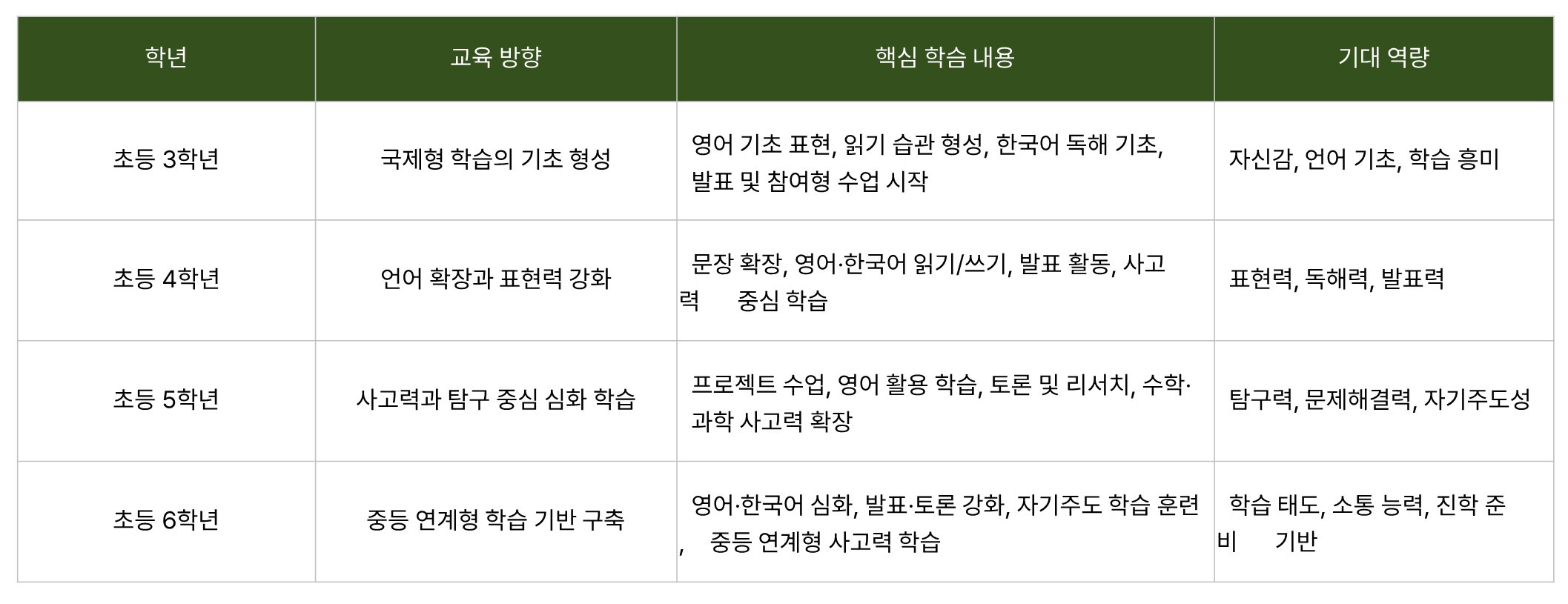 학생의 발달 단계에 맞추어 영어·한국어 균형 교육, 사고력 학습, 표현 중심 수업, 탐구 활동을 단계적으로 운영합니다.